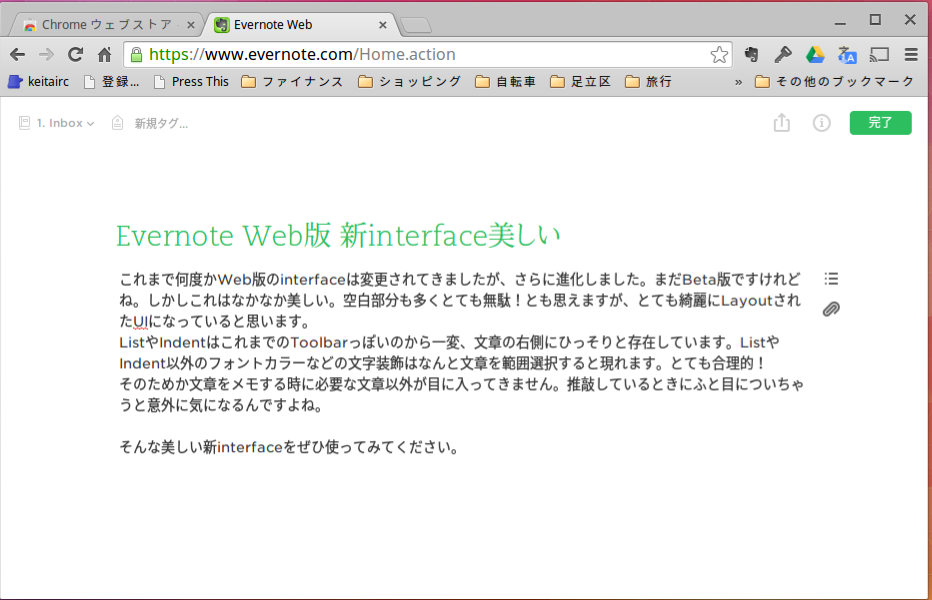 Evernote Web版の新しいUIが登場しました。まだBeta版ですがなかなか美しい仕上がりです。ノートを探したりと言ったメニューが左に並んで右側に編集・閲覧ビューという所は基本のままとして、テキスト編集を始めた所で上のキャプチャー画面の様に必要な機能ボタン以外が消えてとてもすっきりした画面で編集できます。これがなかなか心地よい。